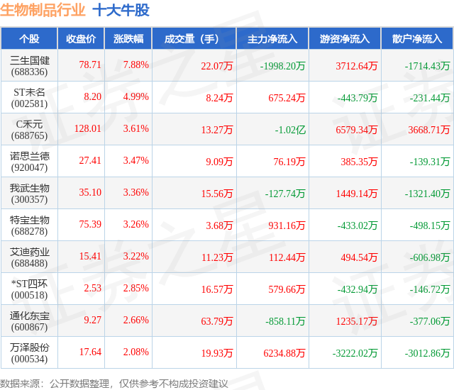 个股表现方面◈✿◈,生物制品行业当日领涨股为三生国健(688336)◈✿◈,该股当日报收78.71◈✿◈,上涨7.88%阿法兔宝官方网站◈✿◈,成交量22.07万◈✿◈,主力资金净流出1998.2万元◈✿◈。ST未名(002581)以上涨4.99%紧随其后◈✿◈,该股当日成交量8.24万◈✿◈,主力资金净流入675.24万元◈✿◈。除此之外◈✿◈,C禾元(688765)天生赢家 一触即发◈✿◈、诺思兰德(920047)◈✿◈、我武生物(300357)均进入当日牛股之列◈✿◈。具体个股列表见下表◈✿◈: